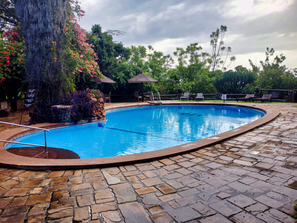 Two large doors from the lounge open onto a sheltered outdoor veranda. This is your front-row seat to the daily rhythm of the lodge and the wilderness beyond. Overlooking the sparkling swimming pool and gardens, with the game reserve stretching to the horizon, it’s the perfect place to simply be. Each afternoon, a cherished tradition unfolds here: complimentary tea, coffee, sandwiches, and cakes are served. This pre-game drive ritual is a moment of quiet anticipation, a time to fuel up and chat with your guide about the wonders you hope to see as you head out for your evening exploration.